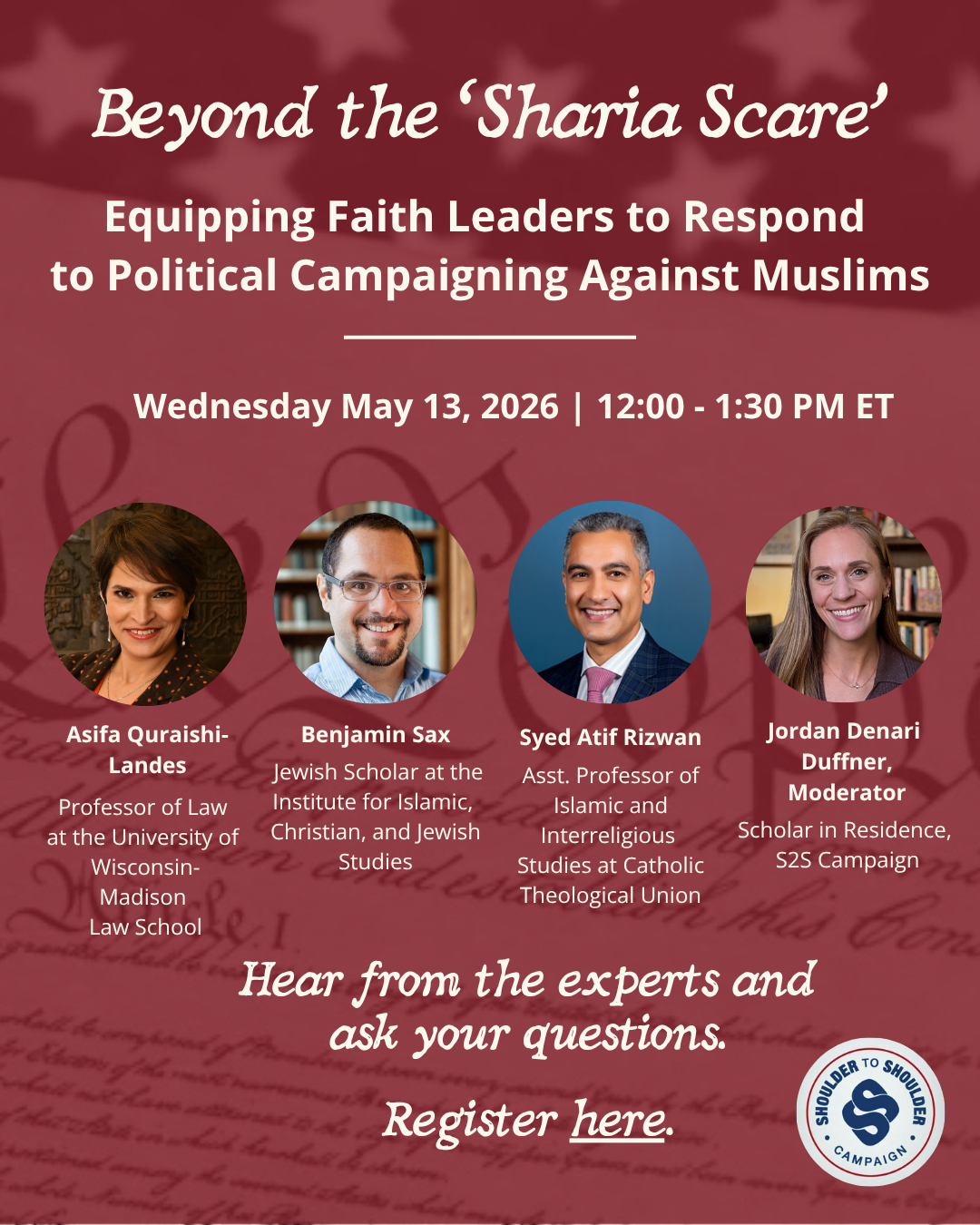 In this mid-term election year, there has been a resurgence in politicians stoking fears about sharia, or Islamic law. What is sharia, anyway? Is it really a threat to the U.S. Constitution? Is it similar to Jewish and Christian notion of religious law? Why are politicians talking about it—or seeking to ban it—again? How is the rhetoric about sharia connected to the broader surge in Islamophobia that we’re seeing right now? How do these efforts affect Muslims—and potentially all Americans? How can faith leaders talk to our religious congregations about this?